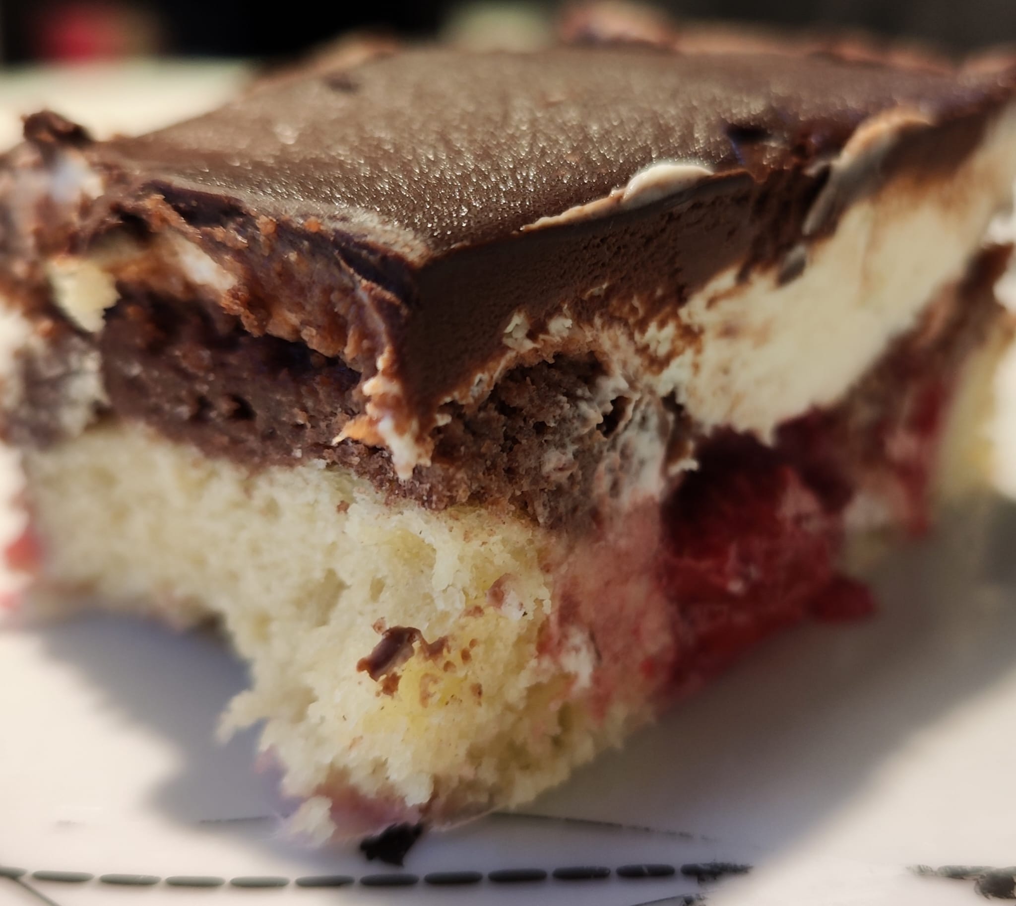 Ingredience těsto / plech 20x20cm Ingredience na náplň: Ingredience poleva: Postup: Elektrickým šlehačem vyšlehejte máslo a cukr do pěny, pak po jednom zašlehejte vejce. Prosejte do mísy mouku s kypřicím práškem, přidejte mléko a smíchejte na hladké těsto. Polovinu těsta odeberte a