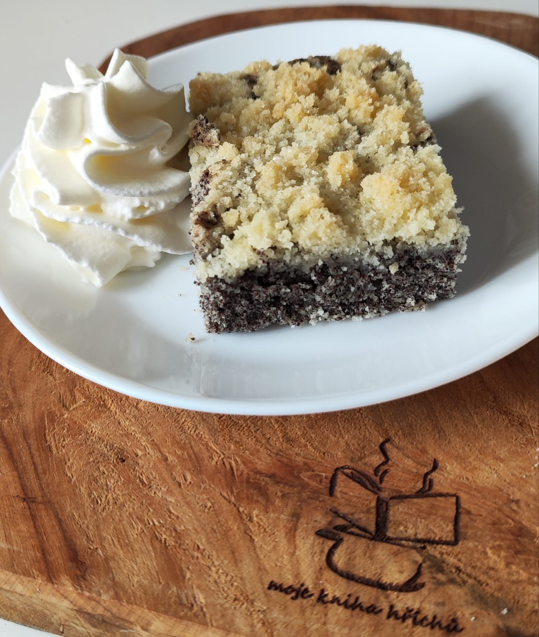 Ingredience: Na drobenku: Postup: Troubu předehřejte na 170°C. Všechny suroviny na drobenku vsypte do mísy a promněte mezi prsty, aby se spojily. Mouku, vejce, cukr, mletý mák, olej, mléko, citronovou kůru, kypřicí prášek a skořici promíchejte v míse na hladké těsto a
