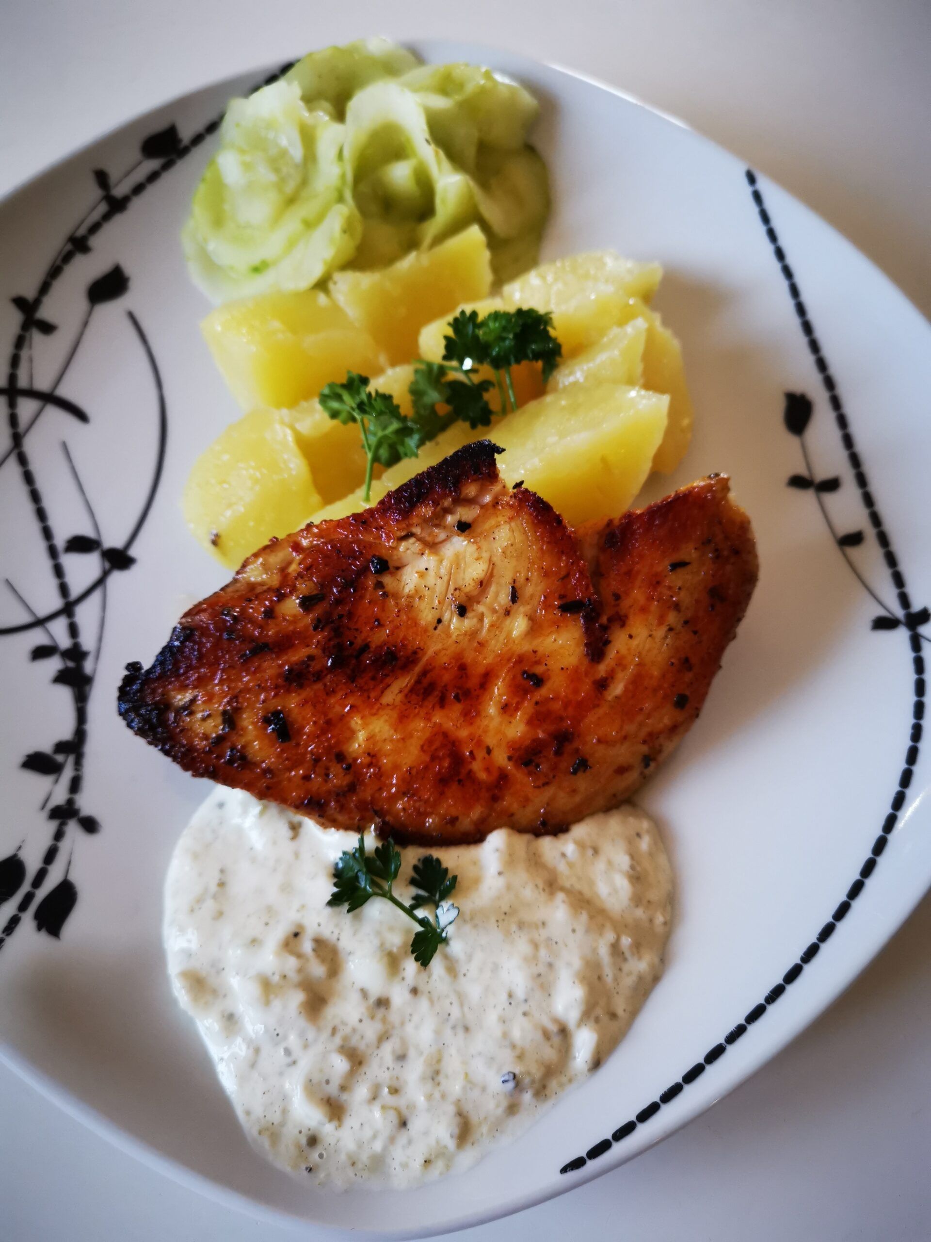 Ingredience: Postup: Brambory sous vide Ingredience: Postup: Okurková remunáda (nakládané okurky ve sladkokyselém nálevu) Ingredience: Postup: Okurková remuláda (dip) Ingredience: Postup: Servírování: Na talíř dej na plátky nakrájené kuřecí prso, brambory s máslem a libečkem, přidej porci okurkové remulády a pár plátků