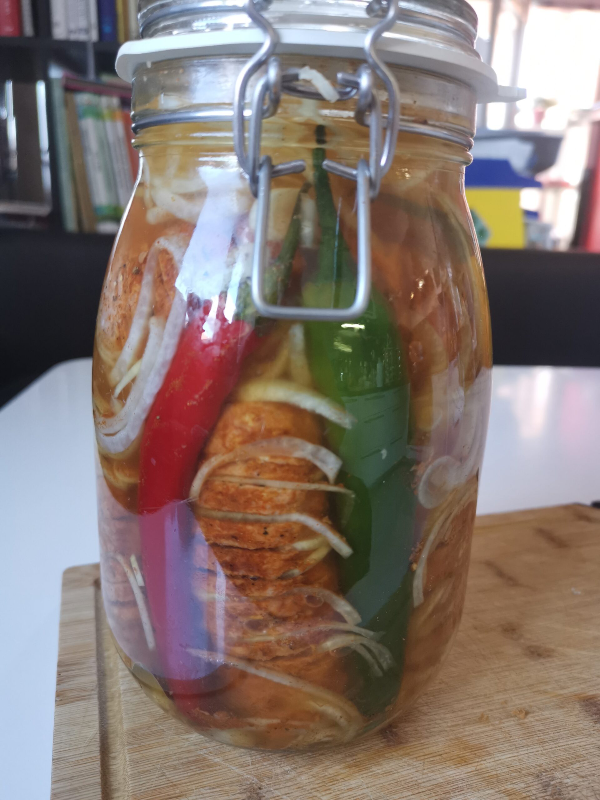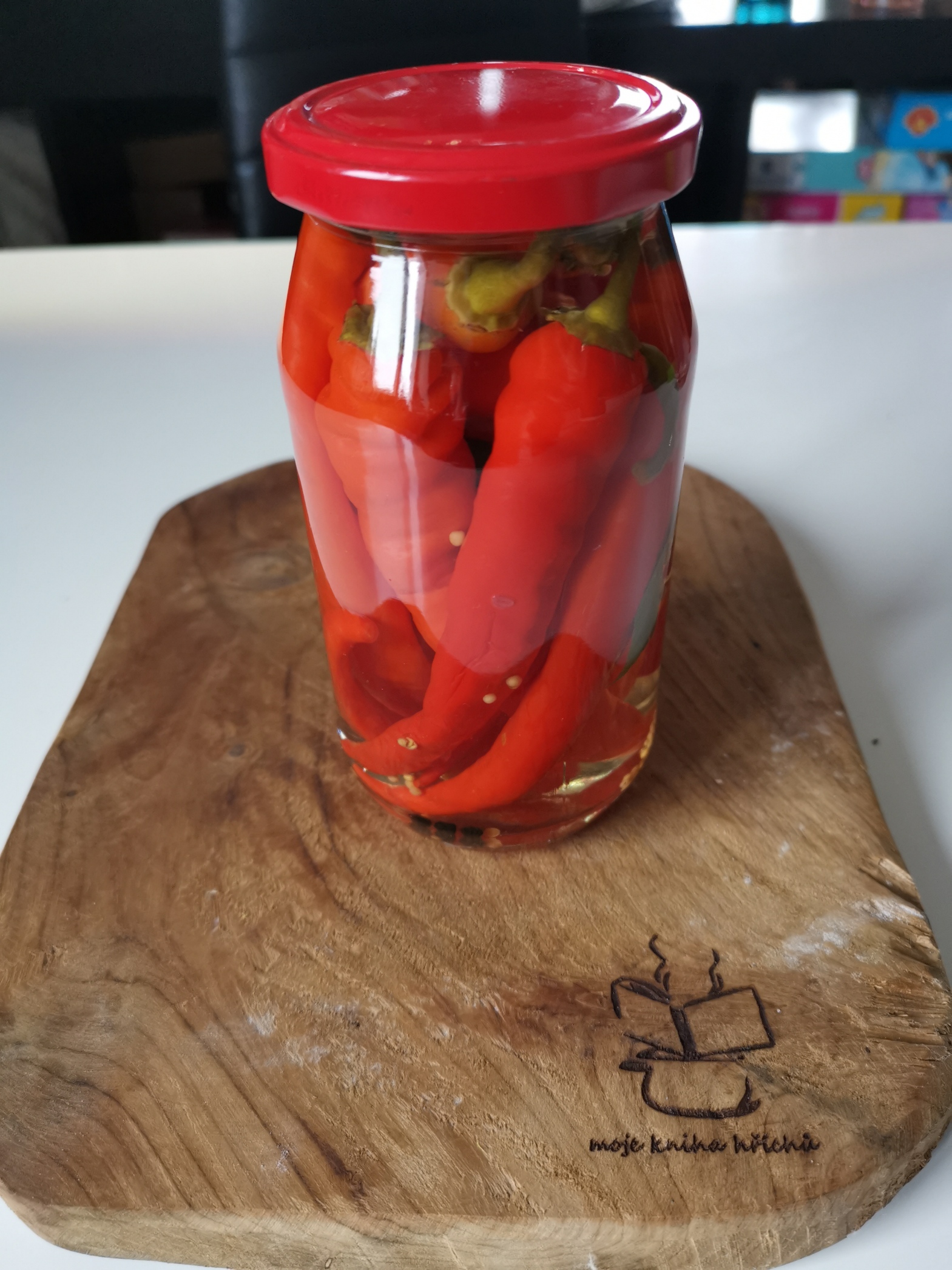 Ingredience: 4 hermelíny 1 chilli papričku nebo kozí roh (nakládané) 8 stroužků česneku 1 červenou cibuli (na kolečka) 150 g nakládané kapie (bez láku) 2 bobkové listy 8 ks černého pepře celého 8 ks nového koření 1 lžičku červené mleté papriky 3 snítky rozmarýnu