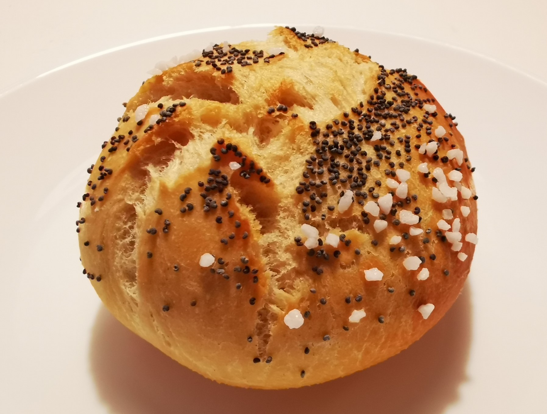 500g pšeničné chlebové mouky 270g voda 60g sádlo rozpuštěné 11g soli 7g instantní droždí 1 lžička sladu (sladěnka) nebo cukru 90min. kynutí Na potírání: 5g jedlé sody 100ml vody hrubozrná sůl a kmín 20min. kynutí bežná trouba 230st. a 20min pečení