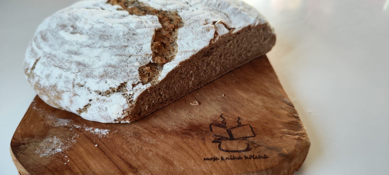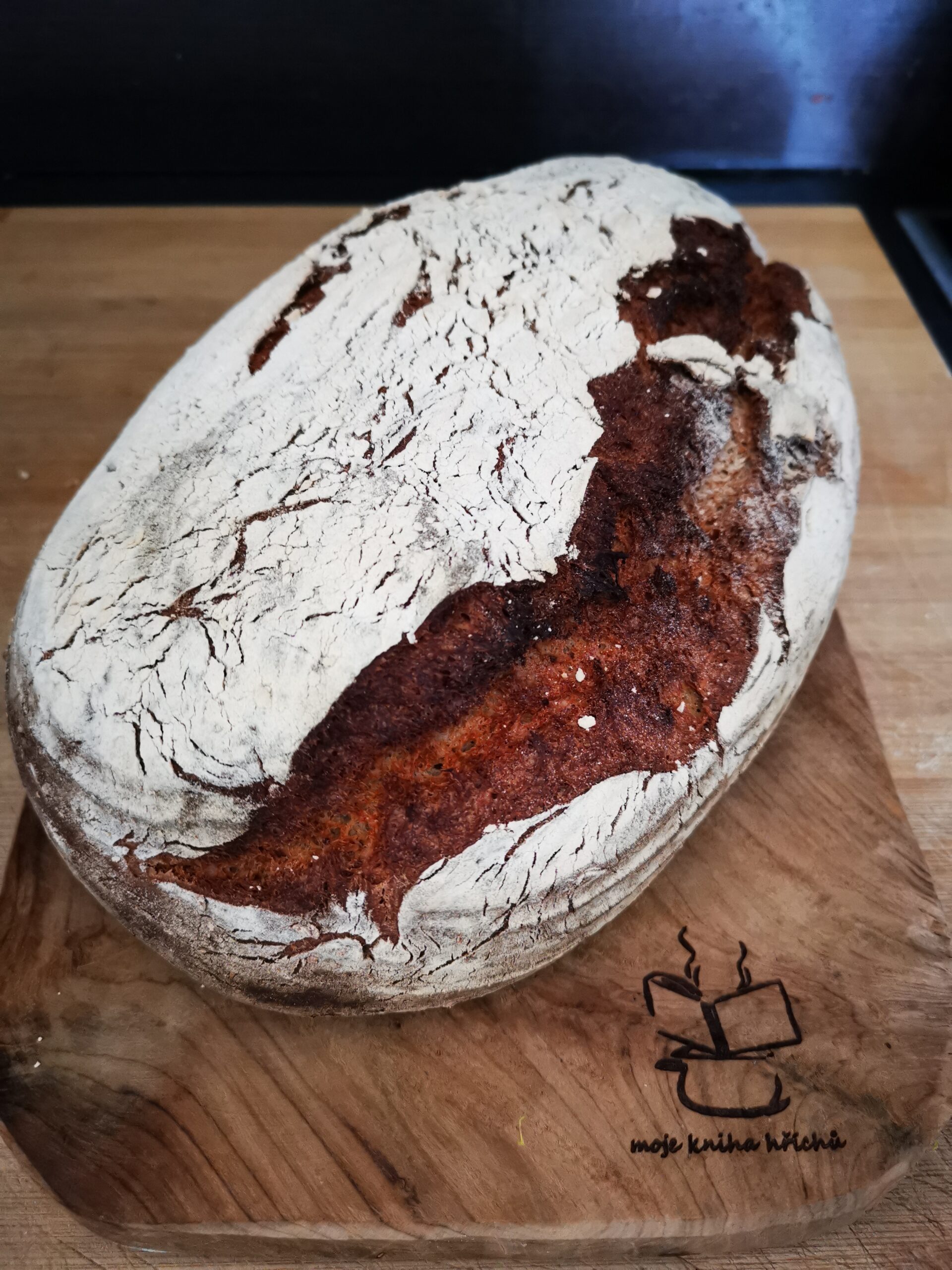 Ingredience: 150g žitná mouka 350g pšeničná chlebová mouka 7g sušené droždí 1 sáček instantního kvásku 400ml podmáslí 1,5 lžičky soli 1 lžička chlebové koření