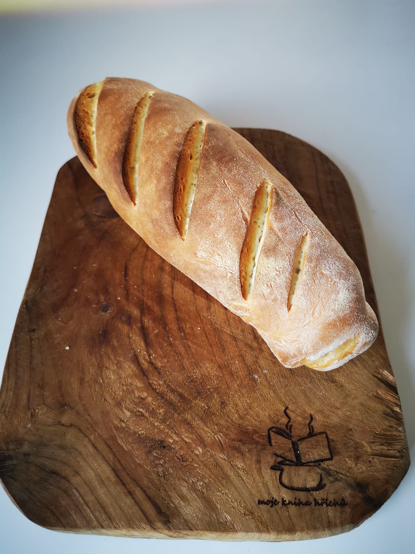 Ingredience: 3 hrnky hladké mouky 1 hrnek vody 1 pytlík (10g) sušené droždí 1 PL oleje (olivový) 1 lžička sůl Teplota: 230°C s párou cca 20min dle velikosti baget (foceno na menší velikosti.. takže cca 13min), čím déle tím více křupavé
