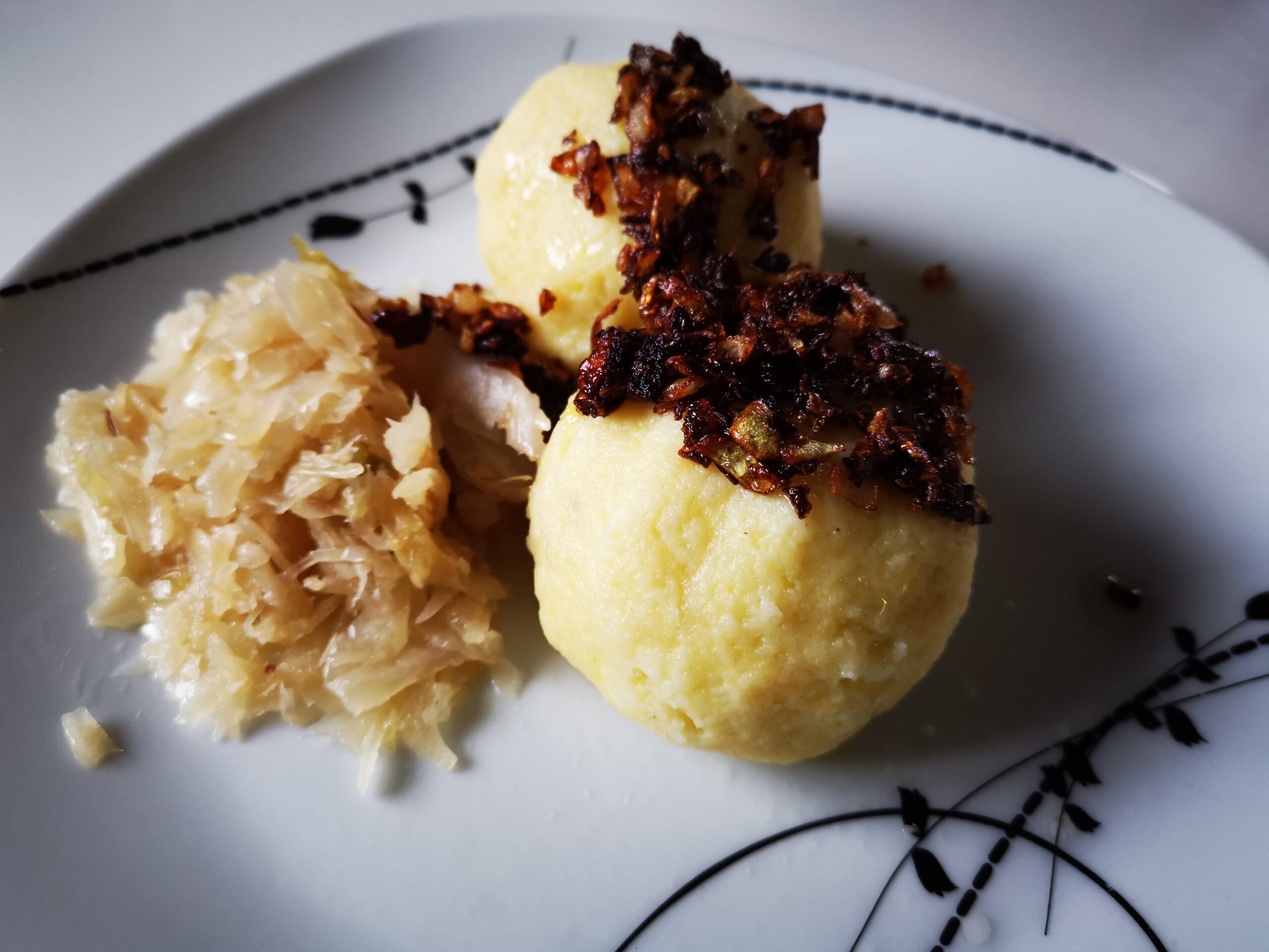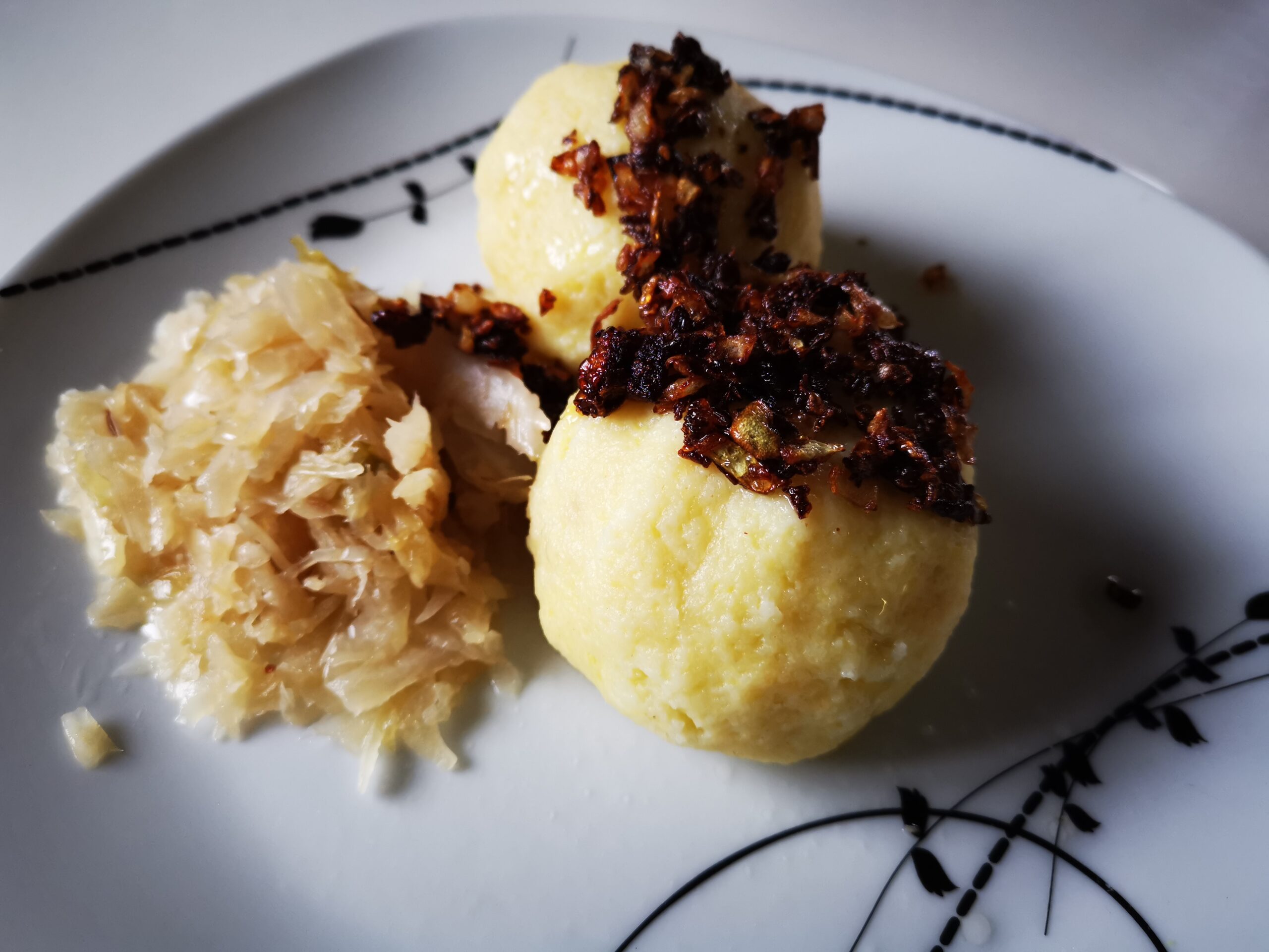 Vyjmi děrovanou lžící a podávej s dušeným kysaným zelím a osmaženou cibulkou.