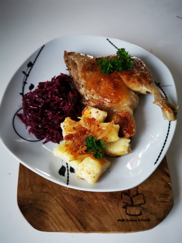 Konfitovaná kachna opečený bramborový knedlík a červené zelí