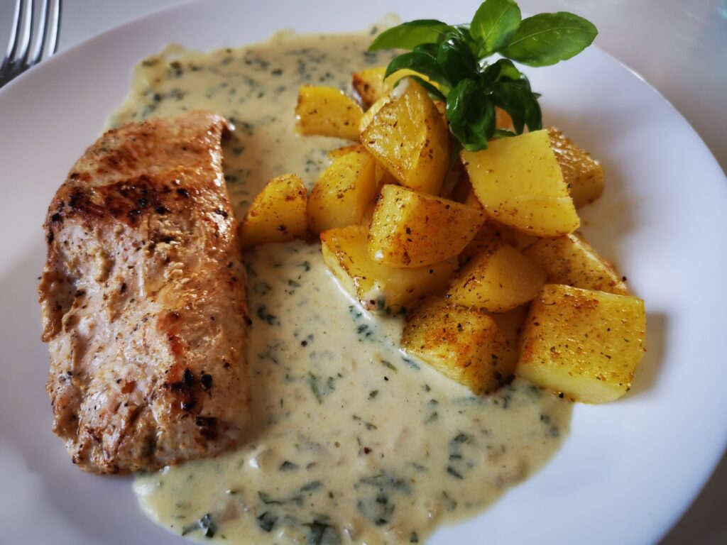 - Nakrájej krůtí prso na plátky, podávej s bazalkovou omáčkou.