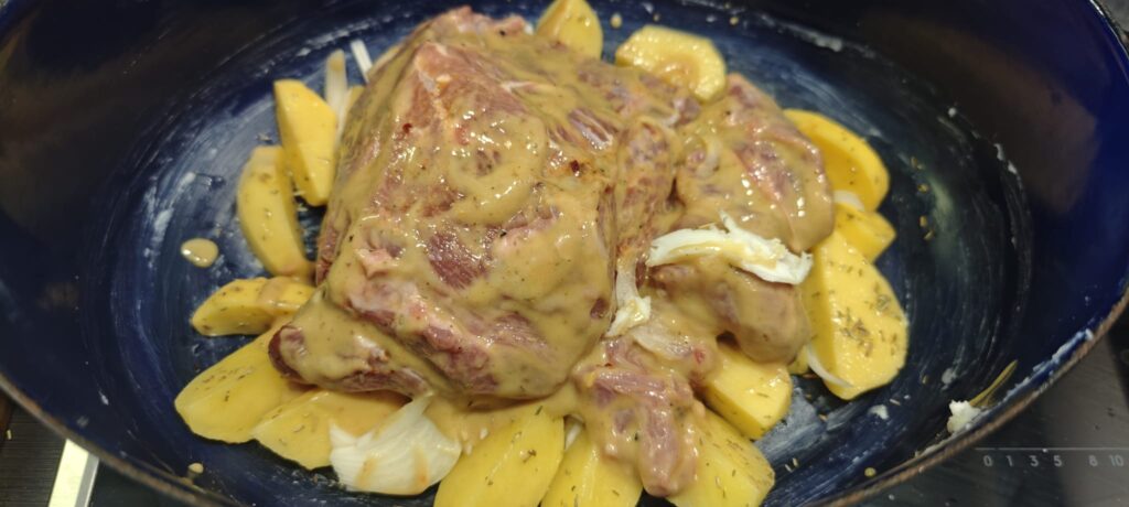 - Postup: Smíchej plnotučnou hořčici, trochu medu, sůl a pepř a Arhgentinu. Maso v tom obal, dej do pekáčku a klidně k němu přihoď na měsíčky nakrájené brambory a na měsíčky cibuli . Máš rovnou i přílohu z jednoho pekáče.