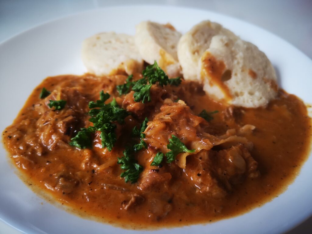Segedínský guláš servíruj s houskovým nebo bramborovým knedlíkem, případně s čerstvým chlebem.