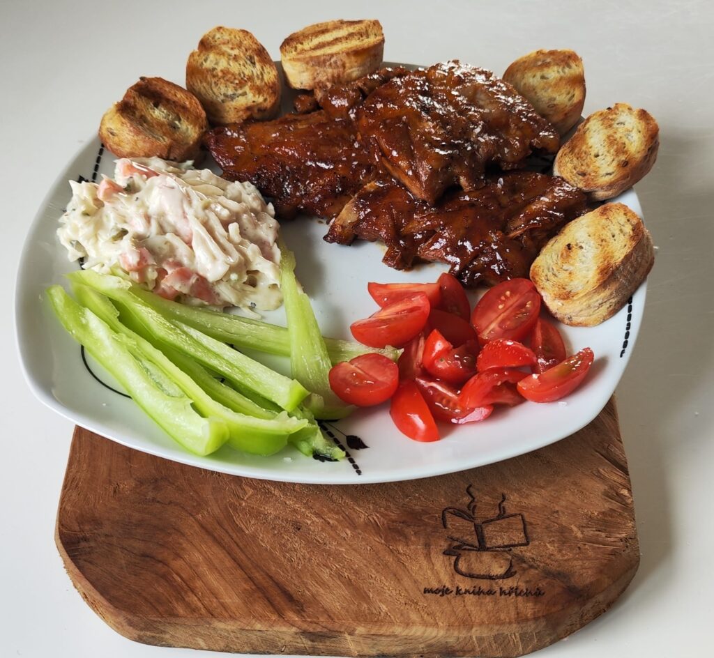 - Během pečení můžeš otevřít troubu a žebra občas pokapat výpekem. Pokud se maso příliš vysušuje, podlij trochou piva, vývaru nebo vody.