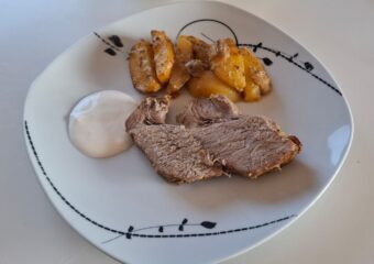 - Maso servíruj nakrájené na porce, spolu s pečenými bramborami, čerstvým chlebem, salátem nebo zeleninovou přílohou podle chuti.