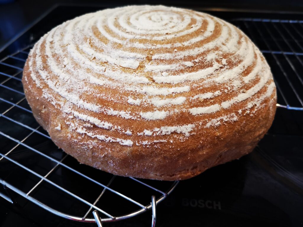 Standardně je střída tmavší a maličko otevřenější, ale vzhledem k absenci váhy, mého zdroje zrna a spěchu jsem musela s osvědčeným poměrem trochu improvizovat „podle oka“. I za polních podmínek na stavbě vznikl krásně pružný, kyprý bochník.