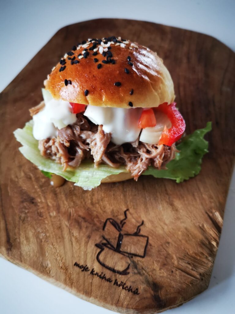 Mléko s vodou do kastrolu a zahřát na cca 40°C odstavit z plotny. Přidat máslo a nechat rozpustit. Přidat rozmíchané vejce. Do robota mouku, cukr, sůl, kvasnice, promíchat. Přidat směs mléka, vejce, másla a promíchat. hodinu kynout. udělat bulky (cca 70g) kynout 20-30min. pomazat vejce a posypat sezamem. trouba bez páry 210°C s párou 190°C