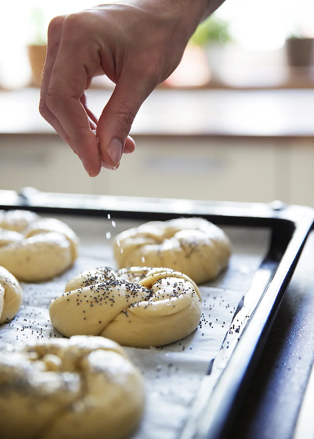 Krok 5: Připravte si hrnek s asi 200 ml vody. Z plechu sejměte potravinovou fólii, housky postříkejte vodou, posypte mákem a solí a plech s nimi umístěte do dolní třetiny trouby, do nachystaného plechu na dně nalejte vodu a troubu zabouchněte. Ihned snižte teplotu na 230 stupňů a po pěti minutách ještě na 210 stupňů. Housky by se měly péct asi 15–20 minut, dokud nejsou zlatavé. Osvědčený je i trik, že je lehce nadzvednete, a když jsou lehčí, než byste čekali, je hotovo. Nechte je vychladit na mřížce a podávejte.