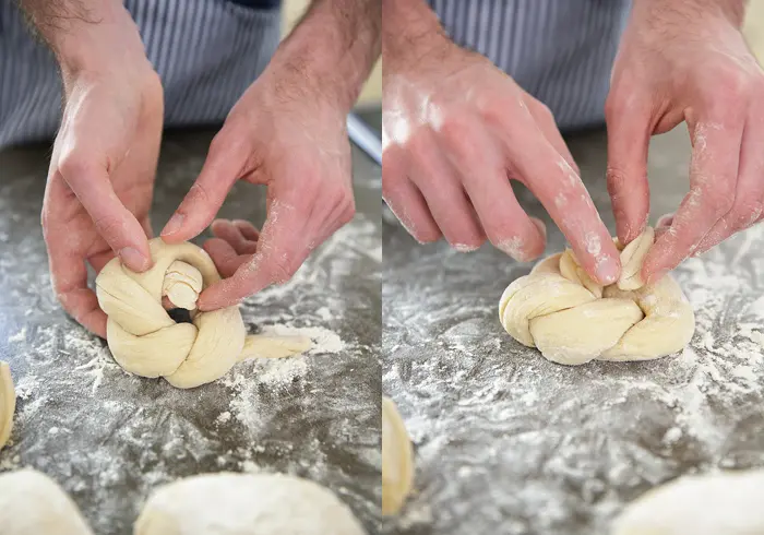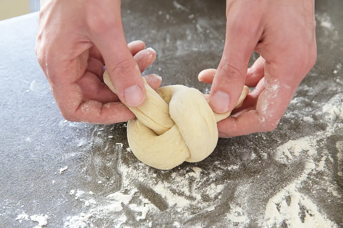 Krok 3: Když zdvojnásobí objem, přeneste těsto na pomoučněný vál a rozdělte na stejné kousky podle kýženého množství housek (my dělali 6). Každý z nich vyválejte v hada a zavažte v klasický volný uzel jen s tím rozdílem, že oba konce kolem hlavního těla housky ještě jednou obmotejte tak, jak vidíte na fotkách.