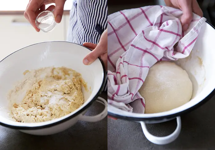 Krok 2: Pak těsto poprašte solí a hnětačem ho propracujte do hladka, trvá to asi pět minut. Zaprašte moukou, přikryjte utěrkou a dejte na hodinu a čtvrt kynout na teplé místo. V polovině kynutí klidně vezměte vařečku a těsto jednou propracujte, prospěje mu to. (Alternativou je nechat těsto kynout v uzavřené nádobě vymazané olejem: neoschne, lépe se rozvine.)