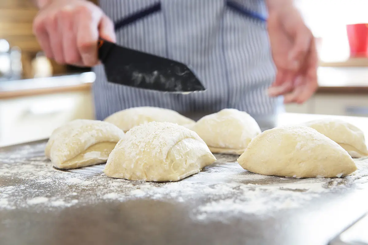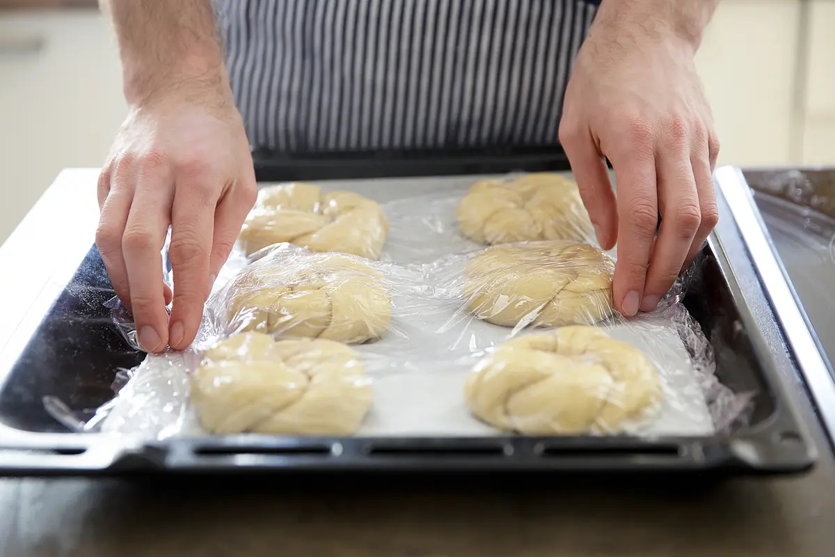 Krok 4: Housky rozložte na plech s pečicím papírem, potřete olejem, přikryjte potravinovou fólií a nechte 30 minut kynout na plechu. Mezitím rozpalte troubu na 250 stupňů na horkovzduch, na její dno položte starý plech.
