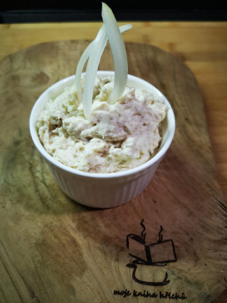 Pomazánky - Saláty Makrelová / Hejková pomazánka Ingredience: 300g makrela nebo hejk – uzená ryba1 menší cibule 2 lžíce pomazánkové máslo2-3 lžíce majonézy 2 lžíce plnotučné hořčicesůlpepř