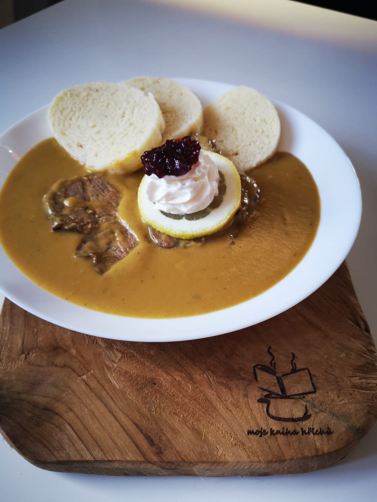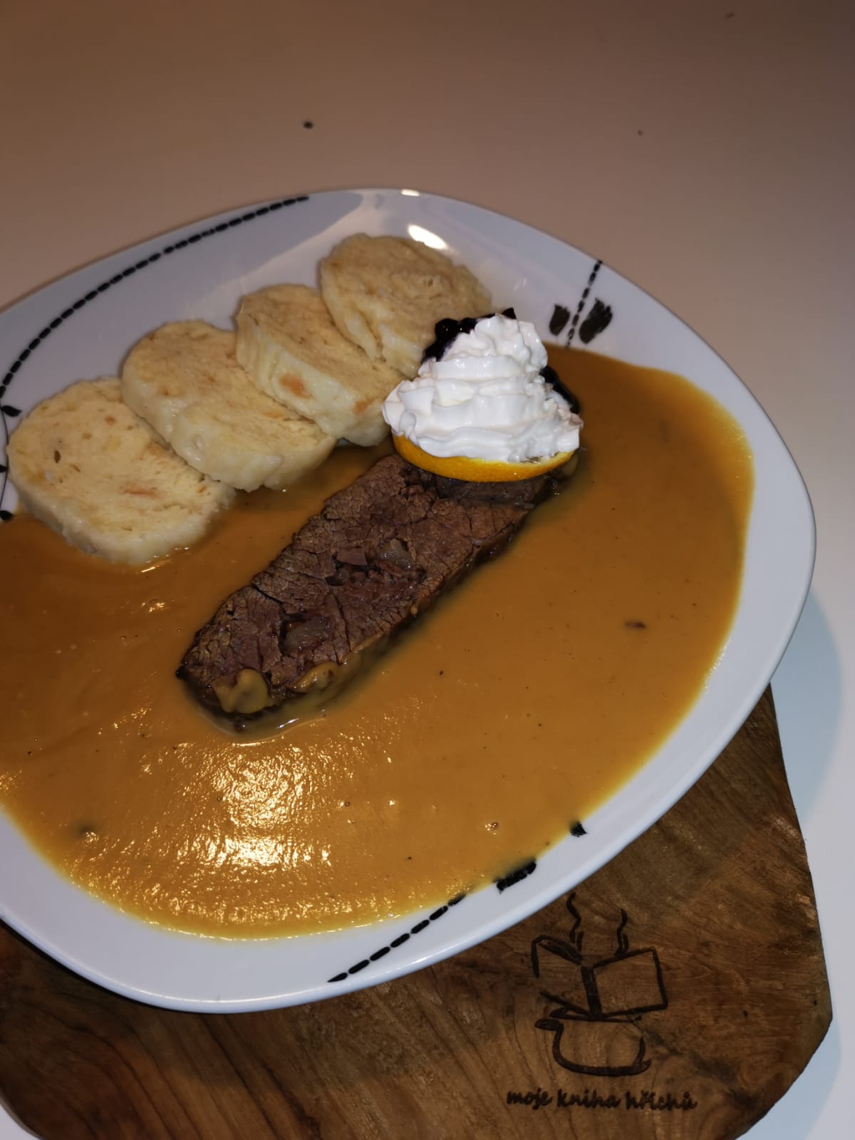Luxusní svíčková z hovězího krku Ingredience: Postup: Tip: Pokud máš ráda(‑rád) jemnější omáčku, vmíchej na závěr lžíci másla.