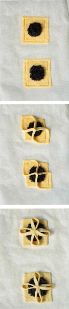 Z těsta vykrojte čtverce 4x4cm. Nožem pak veďte řez po obvodu čtyř rohů zhruba 5mm od okraje. Do středu čtverce dejte lžičku makové náplně a zploštěte ji.