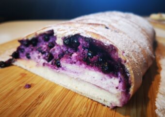 Uvolněte vykrojené protilehlé proužky těsta a spojte je nad středem náplně. Proužky důkladně přitiskněte k sobě.