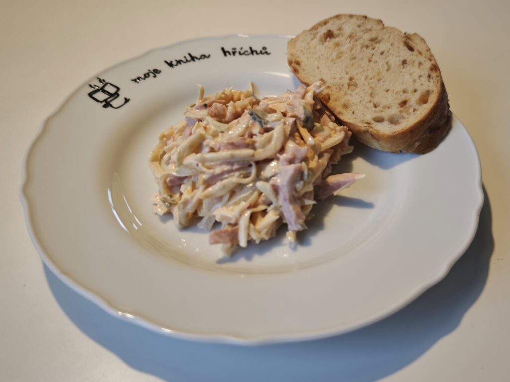 Pak přidáme na nudličky nakrájené okurky, salám, sýr, nadrobno nakrájenou cibuli a vše promícháme.